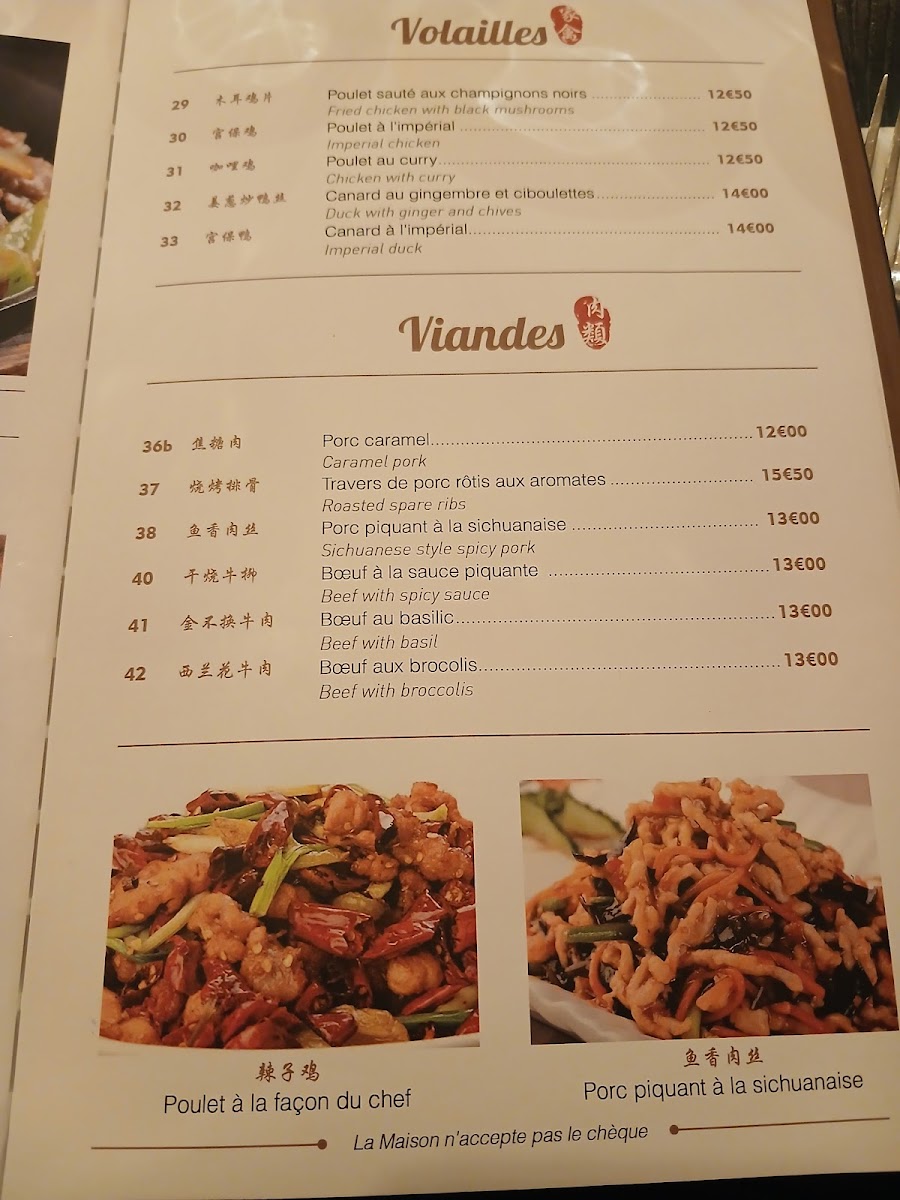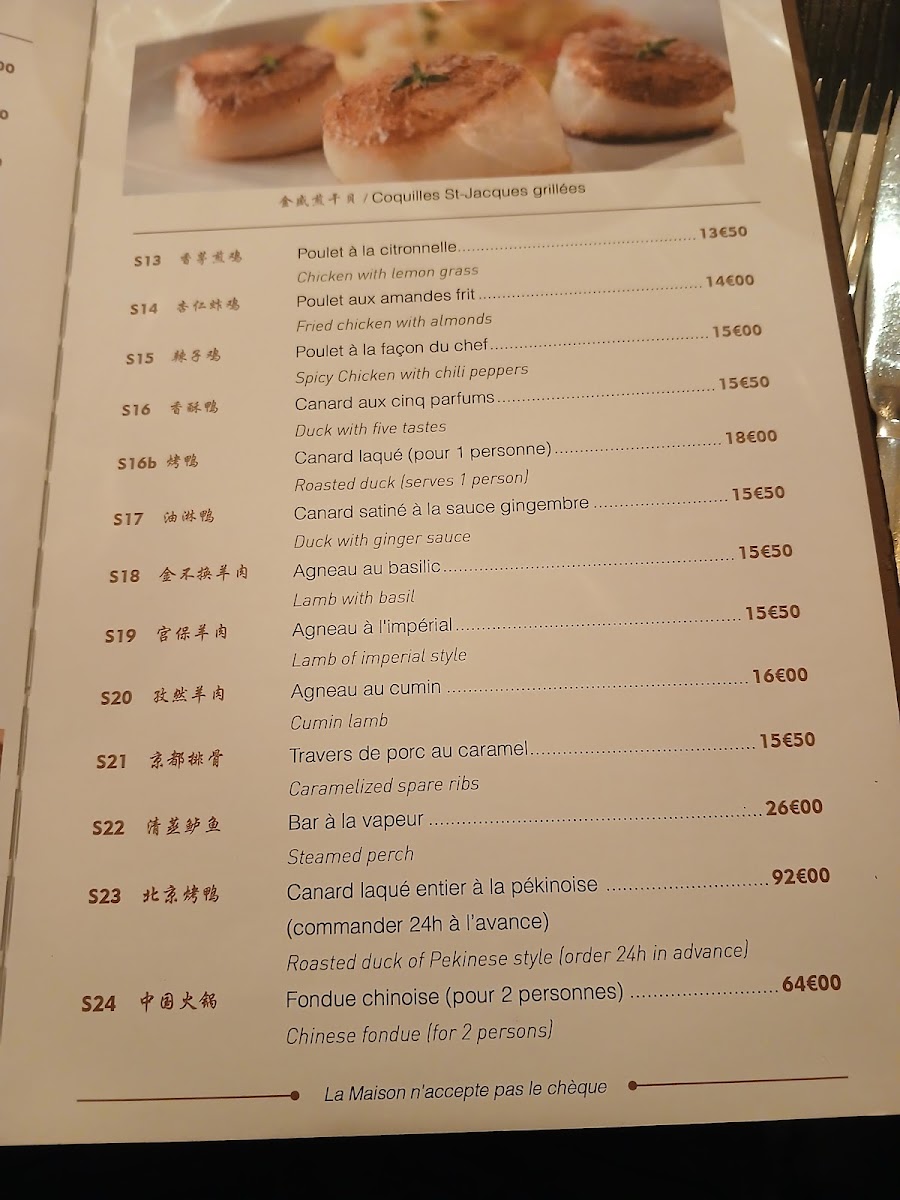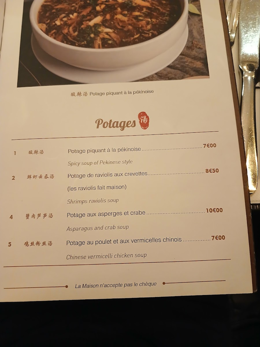 - Soups: Traditional options like Peking-style spicy soup (Potage Piquante À la Pékinoise) and Peking soup (Potage Pékinois) are offered.