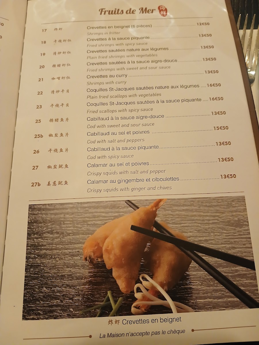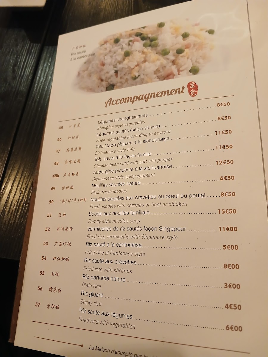 - Appetizers and Dim Sum: This section includes items such as vegetable spring rolls (Nems Aux Legumes), shrimp dumplings, and other small bites.